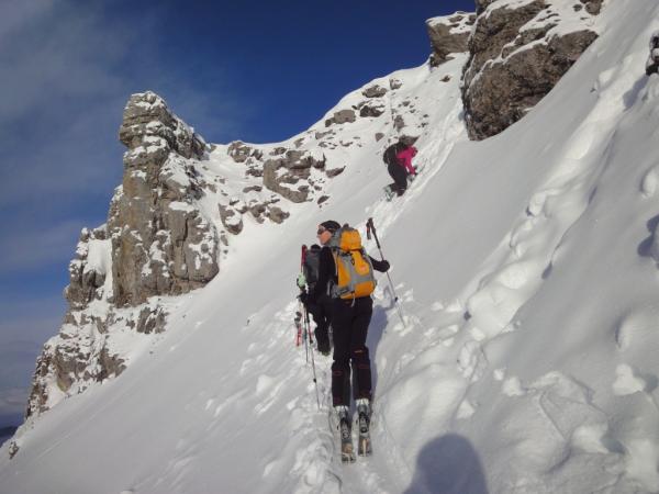Beim Übergang Grätli ohne Ski's senkrecht hinauf. Das ganze Gebiet war unberührt, sowie auch die Abfahrt ins Schafbiel mit bestem Pulver. Im Gipfelbereich und zuvor dem Grat entlang entstanden neue Triebschneeanlammlungen, die leicht auslösbar sind.
