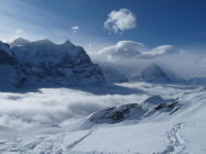 Aufstieg bis ca. 2000 m im Nebel, dann Sonne pur. Ganze Abfahrt im Pulver meist bester Qualität.