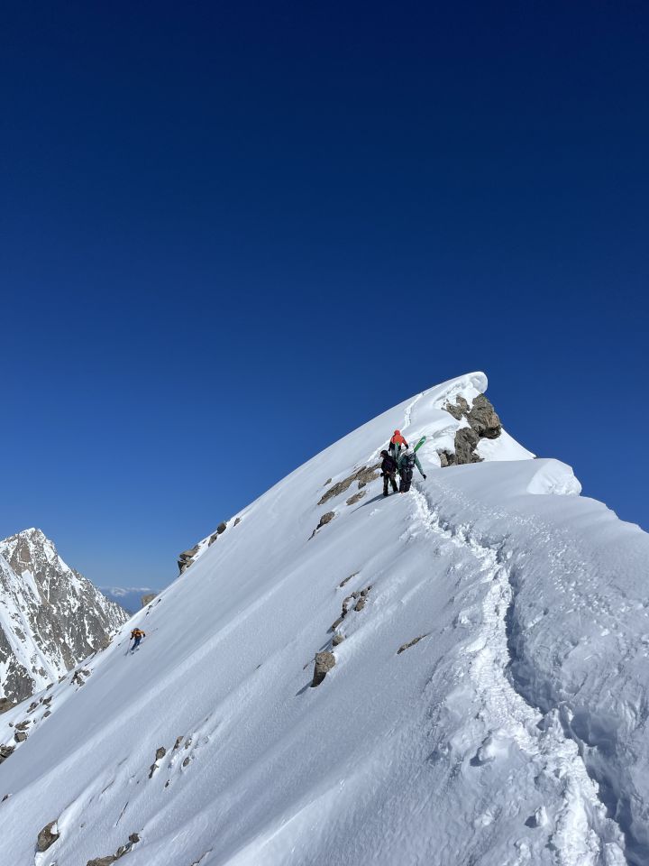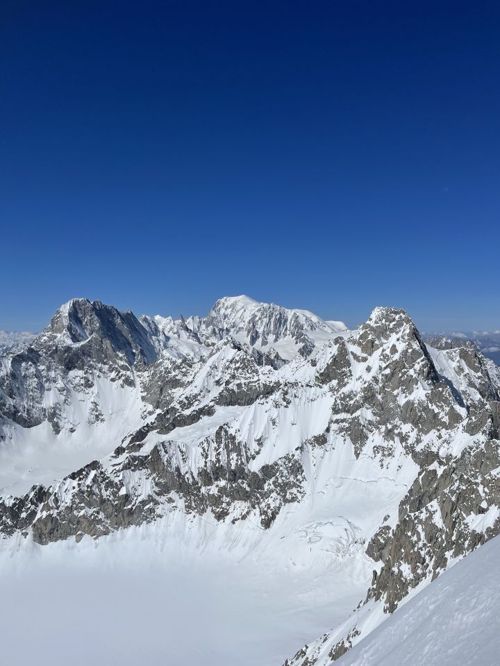 Wunderbarer Aussichtsberg zwischen Mont-Blanc-Gruppe und Walliser Alpen. Insgesamt recht viel Betrieb auf dem Berg, sowohl auf der Normalroute als auch über den Galletgrat, sodass es auf dem winzigen Gipfel und Grat recht eng wurde. Es wurden auch beide Seiten direkt vom Gipfel abgefahren, der Grossteil fuhr aber erst ab dem Skidepot der Normalroute ab.