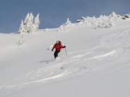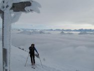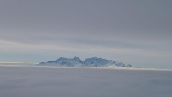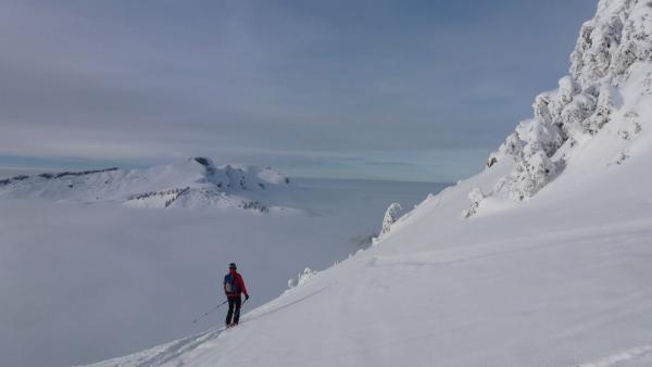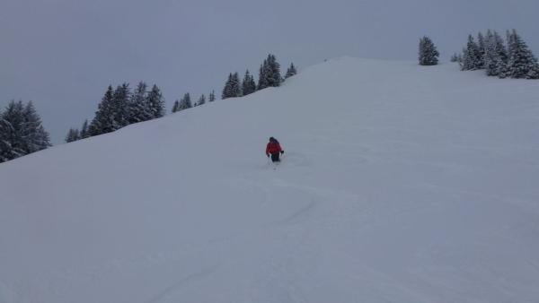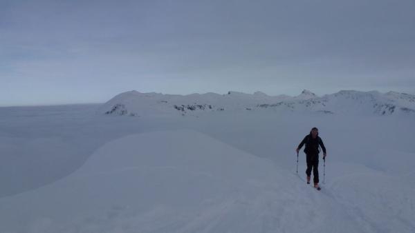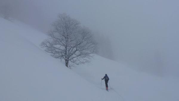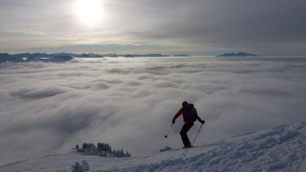 Es gab bis knapp zu den Gipfeln Nebel, manchmal sehr dicht. Die geschlossene höhere Wolkendecke lichtete sich erst, aber rechtzeitig, zur Abfahrt vom Gerenfalben. Der Pulver stibte da nur so im Sonnenschein. Herrlich zum Abfahren in tief verschneiter Landschaft.