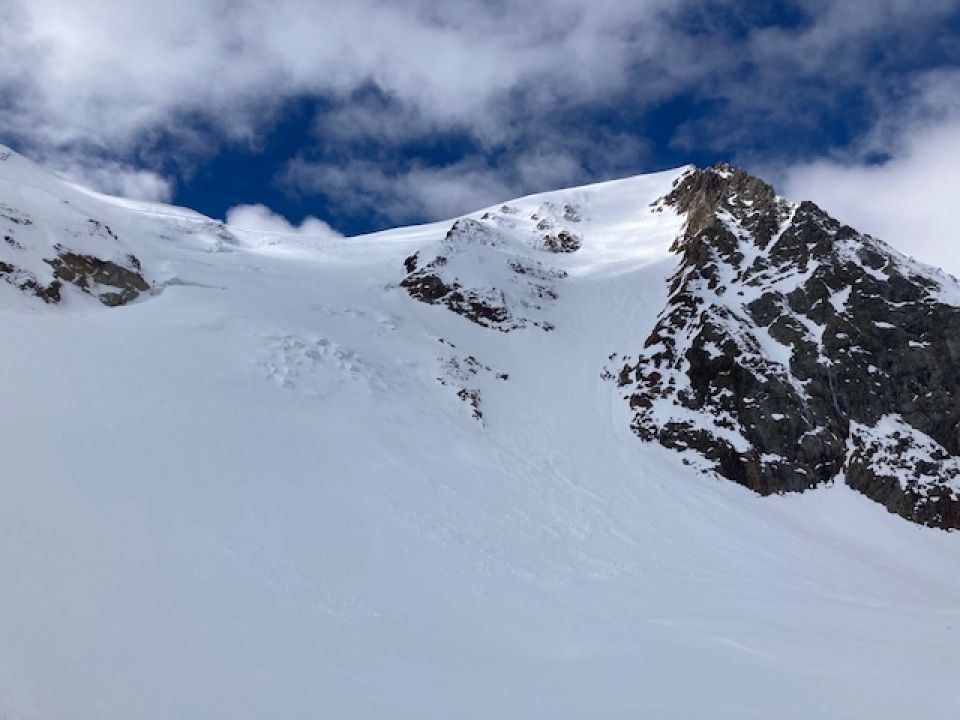Im Aufstieg auf dem Normalweg aufs Gwächtenhorn sah die Nordostwand sehr gut aus. Bald nach der ein Einfahrt in die gut 50° Grad steile Flanke bemerkten wir blankes Eis unter der dünnen Schneeauflage – Absturzgefahr. Zudem war die Sicht nicht so gut, um schon von Weitem die eisigen Stellen erkennen und umfahren zu können. Haben uns mit einer Eisschraube fixiert, Ski gegen Steigeisen getauscht und sind mühsam heraus geklettert. Am gestrigen Sonntag sind 2 Personen die Nordostwand durchstiegen, aufgrund des vielen eisigen Stellen aber auf der Normalroute abgefahren.