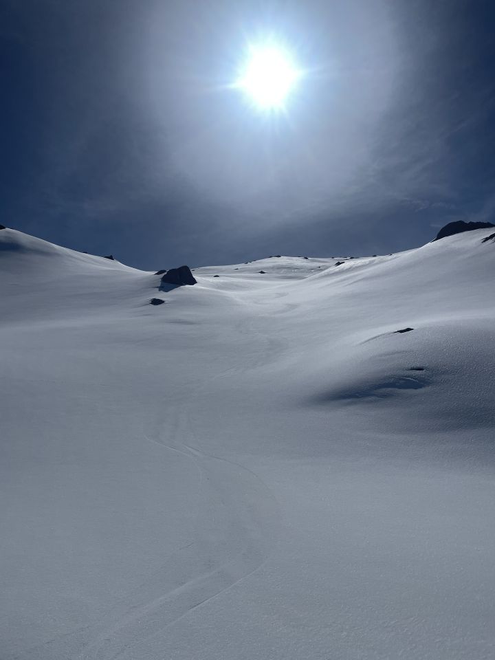 Endlich war ich nun mal hier, und jedenfalls bei solchen Topverhältnissen sind die Ruhe und die unberührten Abfahrtshänge die Skitragerei absolut wert.
