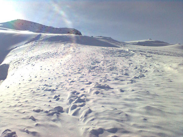 Bis Stelliboden gute Spur.Schneedecke unregelmässig.Teilweise kompakter Deckel aber auch wieder schöner Pulver. Der Wind hat ziemlich gewirkt von Süden.Ab Stelliboden viele gestrige Schneebretter.Geht aber bei guter Routenwahl und sichtigem Wetter gut.