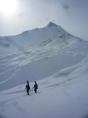 Es hatte mehr Neuschnee als erwartet, je nach Stelle 10-30cm, teils Triebschneeansammlungen. Wir waren die ersten und legten nach bestem Wissen eine Spur bis zum Vorgipfel. Dort hatte es starke Schnee-Verwehungen; und wir liessen die Überquerung zum Hauptgipfel aus; auch weil Sicht & Wetter schlechter wurden. Abfahrt in 30cm schönstem Pulverschnee bis hinunter nach Splügen.