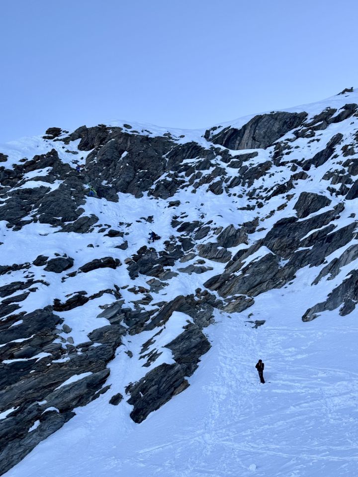 Am Festijoch gute Verhältnisse mit gutem Trittschnee, auch im Abstieg. Wer lieber abseilt: Es gibt zwei Abseilstellen (Reepschnüre mit Maillon, Bandschlinge).