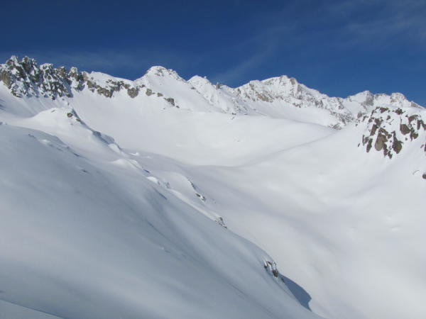 Schöner Pulverschnee auf guter Unterlage, dank der Kälte nach wie vor ohne Deckel, abgesehen von den untersten Hängen. Nebel bis auf ca. 2300 m, manchmal auch höher, weiter oben schön.