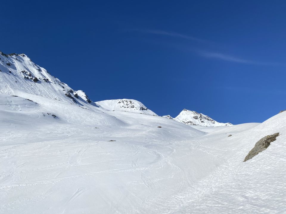 Klare Nacht und minus 1 Grad gegen Morgen sorgten heute Morgen für beste Bedingungen. Schnee ab Straße durchgehend bis Skidepot. Die ersten rund 200 HM verläuft die Tour auf Altschnee, der sowohl beim Aufstieg wie bei der Abfahrt etwas mühsam ist (aber Hauptsache Schnee und kein Tragen). Danach glatte Schneedecken und an den jeweils steilen Stelle eine gute Spur von den Vortagen. So geht es gut bis zum Skideopt auf 3100m. Um 10:30 ist hier der Schnee schon etwas aufgesulzt aber sehr gut tragend. Steigeisen und Pickel kann im Rucksack bleiben, Spur ist sehr gut (z.T. fast Pfad) und dazwischen einige kleinere Felsblöcke. Wunderbare Rundsicht und sehr weit in alle Himmelsrichtungen. Abfahrt um 11 Uhr heute sehr passend für Firn auf der gesamten Strecke. Die Spuren der Vortage stören so gut wie nicht. Ein Highlight der Saison - besonderer Tipp für die Einkehr: in ca 6-7 min Autofahrt erreicht man auf der italienischen Seite Monte Spluga und kehrt dort ins Albergo della Posta ein. Heute mit Tischchen vor dem Haus, Sonne und Windstill. Mit einem Wimpernschlag wie in Italien.