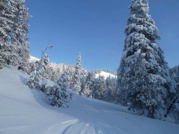 Ab diesem Punkt praktisch der Auftstiegspur entlang abgefahren. Noch 2-3 schöne Hänge mit bestem Pulverschnee