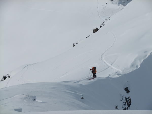 Ab Barentaler Alp bis zum Gipfelhang nur ungespurt. Bis auf Gipfelhang super Pulver. Das Winnetoucouloir war stark ausgeblasen. Fast kein Schnee, was uns zu unwürdigem Seitwärtsrutschen/Tretten zwang. Danach super Pulver bis nach unten.