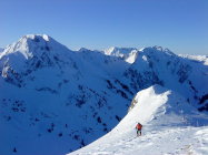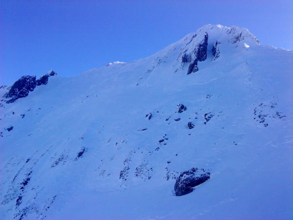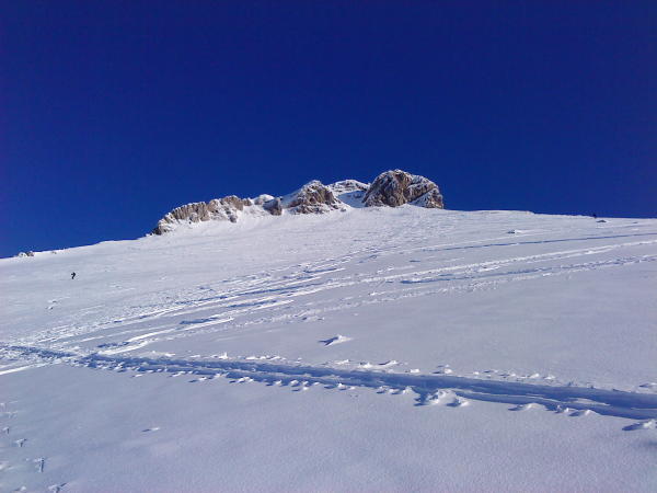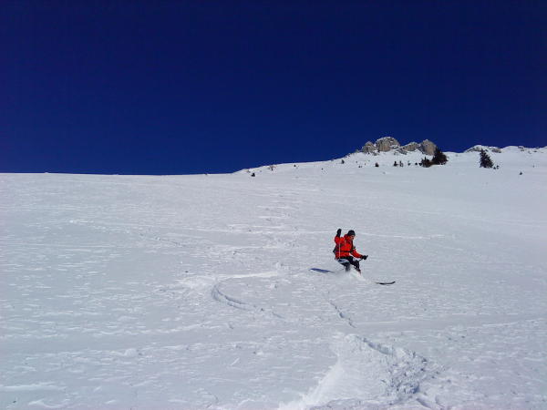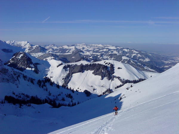 Ochsen: Direktabfahrt vom Gipfel über Westcouloir zuerst hart, dann in Nordwestflanke guter Pulver bis Aufstiegsroute von Schwefelbergbad her.