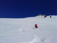 Zuerst auf Alpiglenmäre: nur noch wenige Pulverstellen im unteren Teil der NW-Flanke, Couloirs unter Frilismad hart / zerfahren.