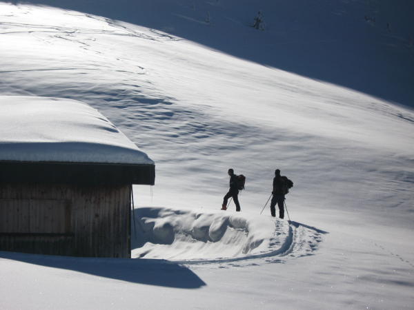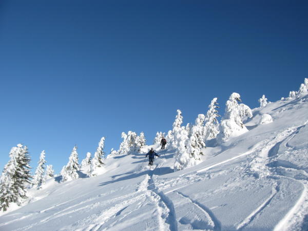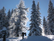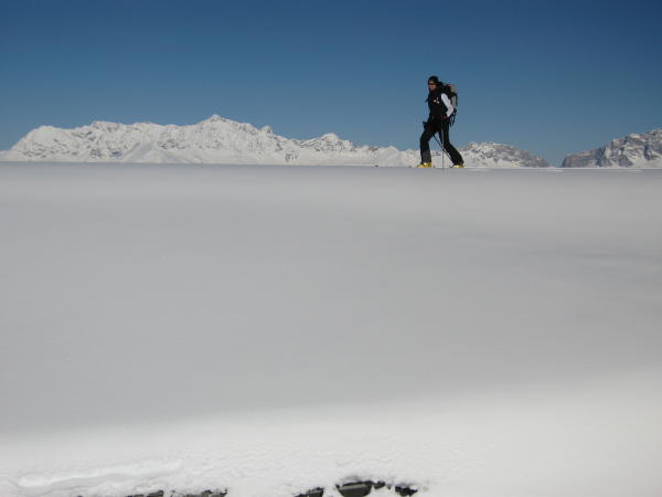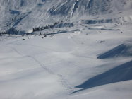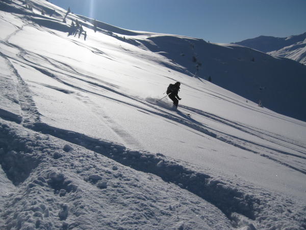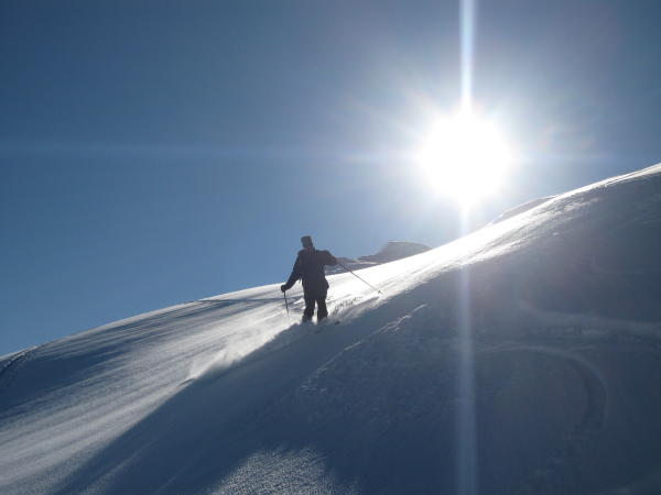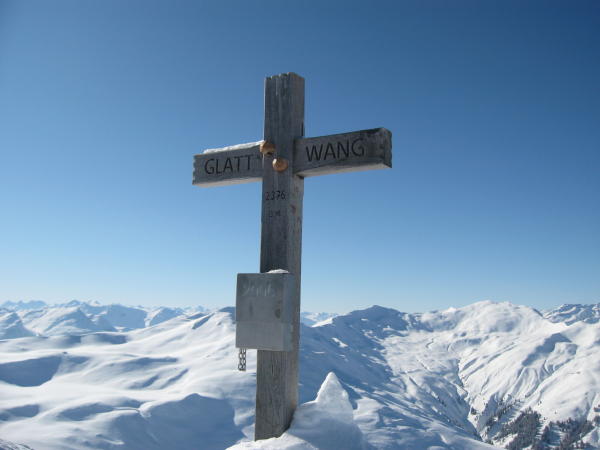 Brrr eiskalter Start bei -21° und der erste Anstieg erfolgt zudem noch tief im Schatten, mit genügend Testsieger ;))am Body dürfte das kein Problem sein. Die nordseitige Tour ist lang, aber wunderschön, oft auch sonnendurchflutet zieht sie durch Waldlichtungen hinauf zur Larein Alp. Ab hier kommt ganz schwacher Wind auf, den man bei diesen Temperaturen sofort als unangenehm empfindet, etwas steiler erreicht man die Schneekuppe, der Gipfel wird erst dort sichtbar. Die unbedeutsame Graterhebung, wie sie beschrieben wird, ist ein tolles Tourenziel mit bestem Panorama. Der Aufstieg auf dieser Seite über den Nordgrat ist steil und glattgeschabt von Abfahrern, zur Zeit kann man gut die Ostseite queren und so bequemer das Kreuz des Glattwang erreichen. Es folgte eine prächtige, lange Pulverabfahrt bis zum Bahnhof.