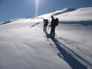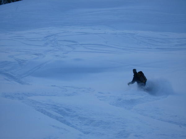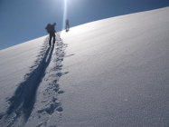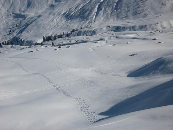 im unteren Teil des Aufstiegs selbst in schattigen Zonen auf steilen Grashängen große Fischmäuler mit reichlich Schnee, diese können gut umgangen werden, Spuren werden mehr, aber viel Platz und Superschnee