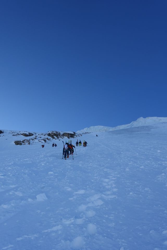 Super Verhältnisse am Grand Combin, wie schon im letzten Eintrag dazu beschrieben (Tour am 18.05.). Im Zustieg Ski bis auf gut 2.200m unter die Muräne tragen (s. Bild). Turnschuhe lohnen sich daher m. E. sehr. Couloir du Gardien mit super Stapfschnee (alles zu Fuss). Ausstieg 3-4 m eisig, ging für uns noch gut ohne Sicherung, an solchen Stellen bin ich aber recht froh, ‚richtige‘ Steigeisen und einen guten Pickel dabei zu haben (einer war ausreichend). Mur de la cote mit pickelhartem Schnee und oben mit einigen Rillen / Stufen durch diverse Vorgänger. Mit Ski vorsichtig abzusteigen, bevor man weiter abfahren / abrutschen kann (Bild; ggf. einen Pickel zur Hand nehmen). Le Corridor ebenfalls gut mit z. T. eisigen Querungen, die aus den Eisabbrüchen resultieren, aber letztlich kein Problem darstellen. Südwand von der Valsorey wurde auch gemacht und sah von oben gut aus. Eisiger Wind trübte den Gipfelgenuss ein wenig, der dementsprechend kurz ausfiel. Insgesamt sehr eindrucksvoll.
