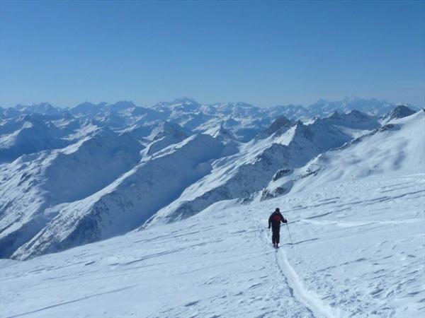 Mit der ertsten Bahn um 08.25 (Tourenbillet, Halbtax 27.-) bis Hockenhorn, Via schwarze Piste in die Rote und bevor die Piste rechts runter geht. Piste verlassen und angefellt. Abfahrt Auf Abstiegsroute bis unter Tennbachlücke und ab da gerade hinunter über P2813/P2629/P2547/P2337 und ab da in die Route 332b