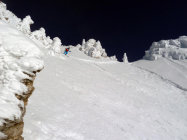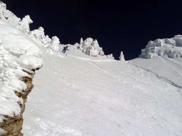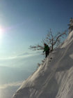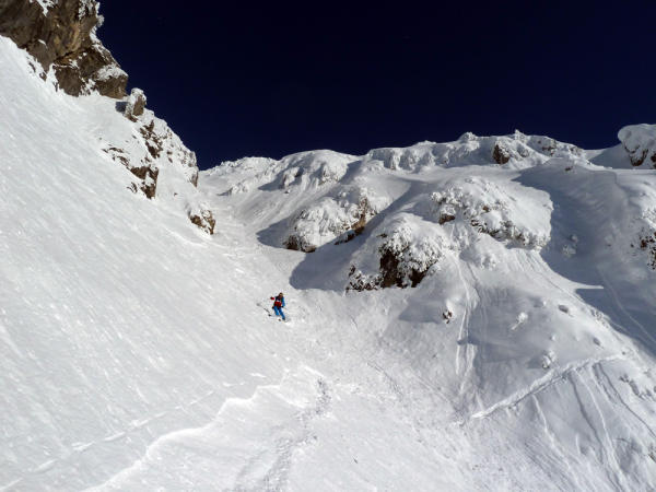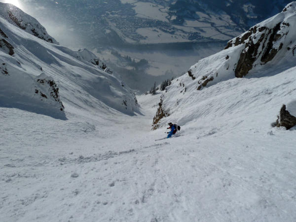 Die westseitige Rinne hatte sehr guten Pulverschnee zu bieten. Im Vergleich zur am Vormittag befahrenen Nebelhorn Nordwand (siehe Berichte von Alban hier im Forum und auf www.rockports.de) deutlich bessere und nicht so wechselhafte Verhältnisse, kein harter windgepresster Schnee, kein Pulver auf eisigem kein Harsch.
