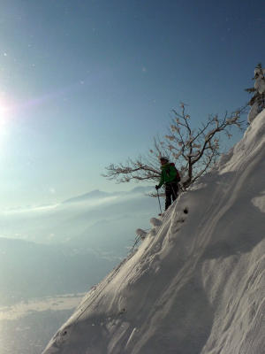 bestens gesetzte Schneedecke. Die in solchem Gelände üblichen oberflächlichen Schneerutsche hatten aber teils größere Ausmaße.