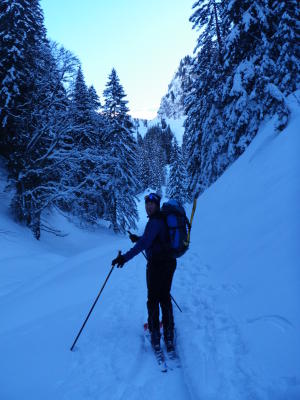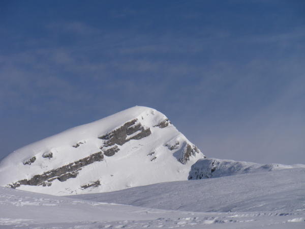 Leider haben sich die Abfahrts-Verhältnisse seit dem Gipfelbucheintrag vom 5.2.12 stark verschlechtert (vermutlich infolge der Erwärmung von Mi und Do). Vom Skidepot bis P. 1820 fast alles "decklet" und kartonmässig, sprich Beinbruchschnee. Ab 1820 m dann meist Pulver.