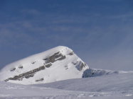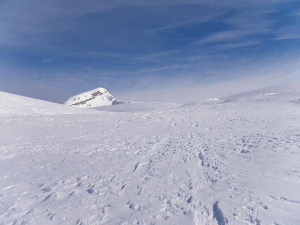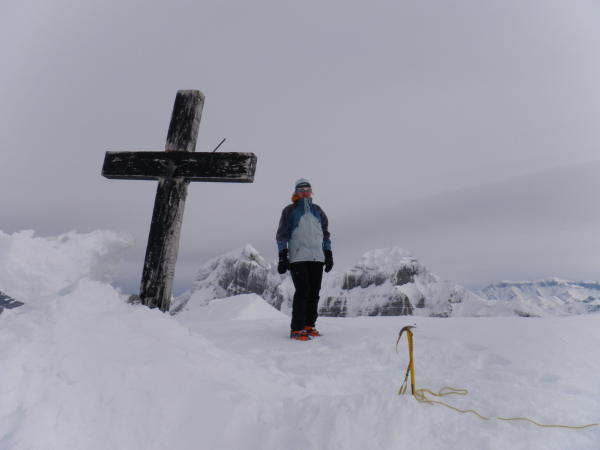 Für den Gipfelaufbau waren Steigeisen und Pickel nützlich. Wir hatten noch eine Reepschnur über die kurze Felsstufe dabei. Guter Trittschnee.