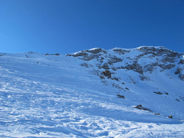 im oberen Teil stark verblasen, kleinräumiger Wechsel zwischen Pulver, Hart- oder Deckelschnee, im unteren Teil feiner Pulverschnee, mit Skis bis zum Gipfel gut machbar, griffiger Schnee am Grat