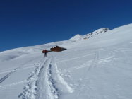Am Morgen wunderschönes Wetter, ab Mittag Wolkenaufzug und schlechte Sicht. Allein auf dem Gipfel. Abfahrt: Gipfelhang trotz extremer Zastrugis am nordöstlichen Rand sehr gut zu fahren (hart gepresste Schneeplatten). Ost- (Steil-) Abfahrt (ab P. 2769) und "Rest": kleinräumig wechselnd alle Schneearten, nur die letzten ca. 300 m ob Mathon noch weitgehend pulvrig.