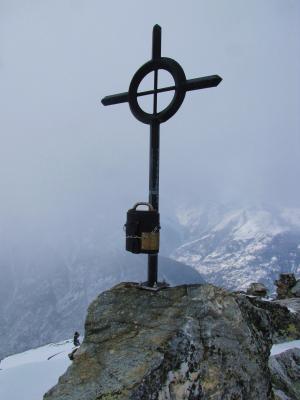 Aufstiegsspur zum Teil verweht und hart (Harscheisen von Vorteil). Auf dem Gipfel dann starker Wind aus südosten mit Nebel und Schneefall.