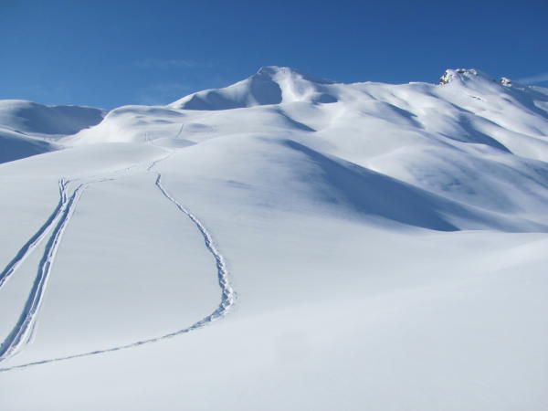 Südseite derzeit nur für Aufstieg lohnend (im oberen Teil jede Menge Gleitschneerutsche). Nordseite mit prächtigem Pulverschnee von oben bis unten. Bisher noch wenig verspurt.