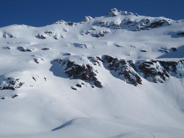 Wumm-Geräusch in Gipfelnähe. Triebschnee beachten und meiden.