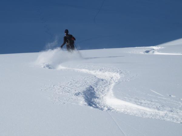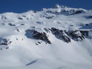 Pulver; Richtung Gipfel zunehmend windgeprägt
