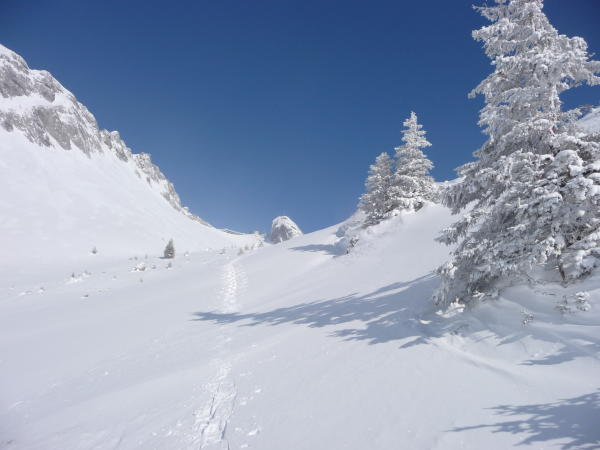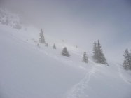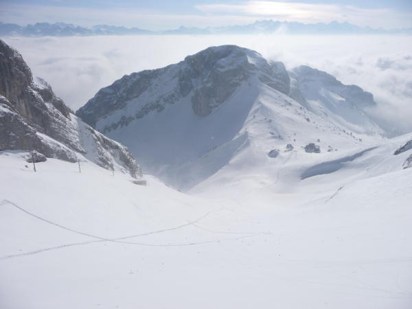 Hochnebel bis Alp Fräkmünt, auf dem Pilatus Kulm traumhaftes Wetter. Im obersten Teil stark verblasener Schnee mit teils Harst-Deckel. Unterhalb 1800 m Pulver, teils vom Feinsten.