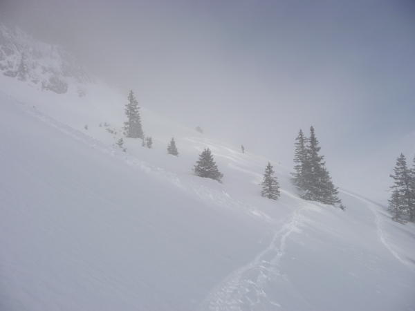 Aufstieg zum Birchboden (Gegenanstieg bei der Abfahrt)grosse Schneewächte am Grat, die einen gefährlichen Eindruck hinterlassen hat. Besser südlichere Aufstiegsspur wählen.
