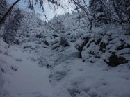 Rechte Rinne Der deutlichen Rinne von der Brücke folgen. Es sind 5 Stufen bis WI3. Nach der dritten Stufe rechts halten. Am Ausstieg ziemlich direkt nach Süden, leicht ansteigend bis man auf den Normalweg trifft. Insegesamt ca. 250hm, 1.5h