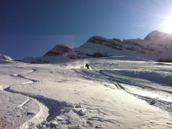 Viel Pulverschnee und wenige Spuren beim Abfahren. Wald teilweise sehr steil, aufpassen beim Routenwahl.