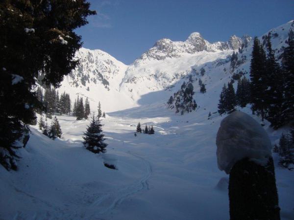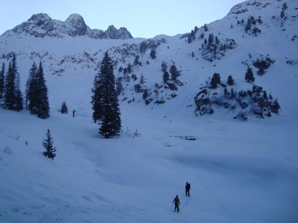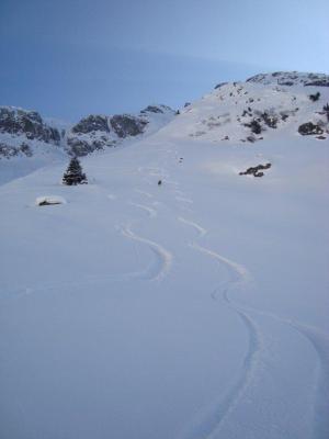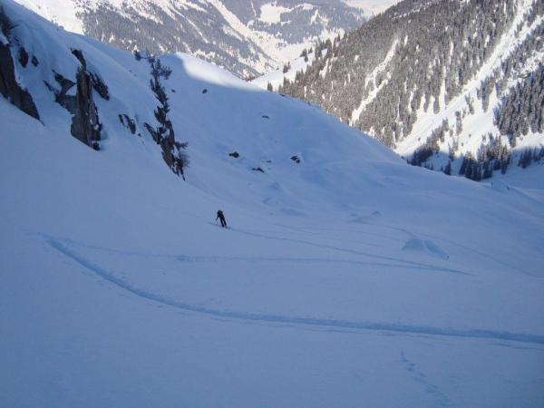 Lawinenwarnstufe 3. Pulverschnee bis auf etwas über 2400m, dannach Windgepresst. Keine Setzungsgeräusche am steilen Nordhang der zu P.2317 hoch führt.