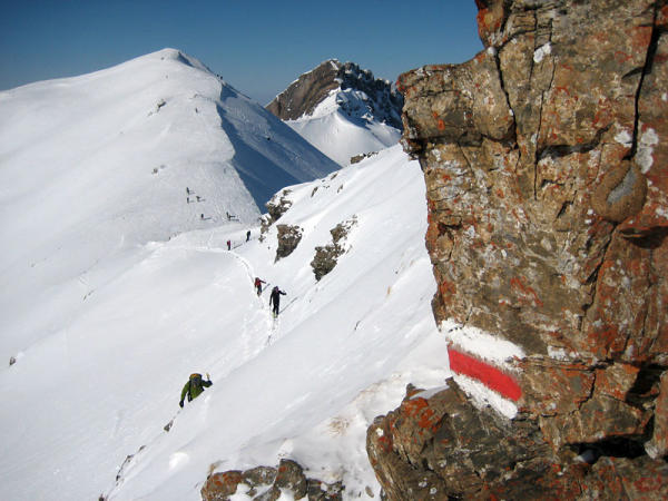 Ausgezeichnete Verhältnisse mit ausreichend Schnee im ganzen Gebiet; Gipfelcouloir Spitzmeilen mit guten Tritten, ein Pickel ist trotzdem hilfreich. Querung vom Sattel zum Couloir-Einstieg ist möglich, erfordert aber etwas Vorsicht (Triebschnee). Abfahrt nach Engi bis zur Busstation bzw. Beiz möglich.