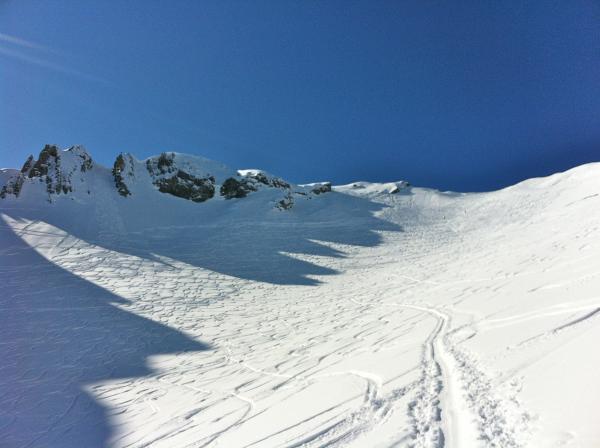 Noch Pulverschnee im Schattenbereich. Auf der Sonnenseite schon leichter "Deckel".