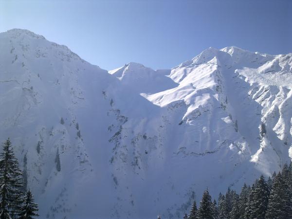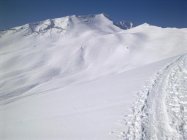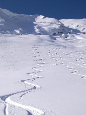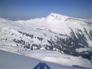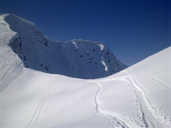 Gipfelhang schon sehr zerfahren - dann über herrliche Skihänge hinab ins Starzeltal.Super Pulverschnee.