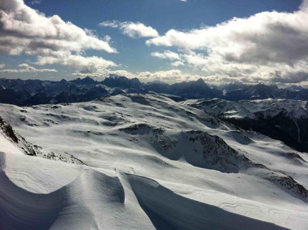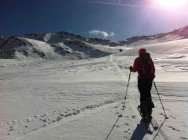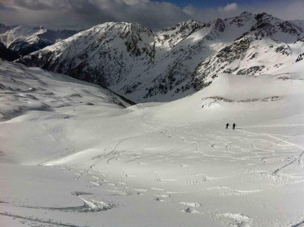 Auf der Tour liegt ausreichend Schnee. Zum Teil abgeblasene Stellen, in den geschützten Bereichen ist auch noch Pulverschnee zu finden.