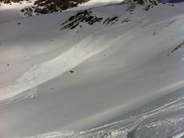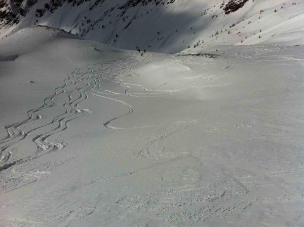 Durch einen Tourenfahrer wurde in einer steileren Rinne ein Schneebrett ausgelöst. In den Süd - Ost Expositionen waren verschiedentlich abgegangene Schneebretter zu sehen