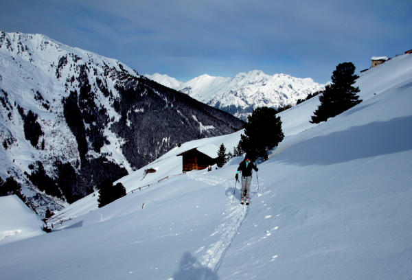 Ab Povers Hochleger unterschiedliche, aber an sich recht vernünftige Schneequalität. Im Gipfelbereich teilweise recht abgeweht, Abfahrt jedoch ohne Felskontakt möglich. In den stärker besonnten Hängen bereits Pappschnee, welcher heute nacht sicher durchfrieren wird.