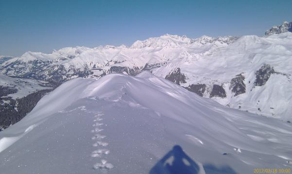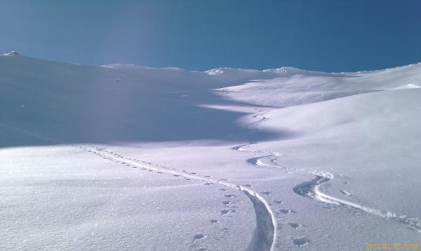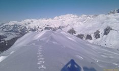 Viele neue Rutsche n den Südflanken, doch auf meiner Aufstiegsspur nur ein einziges Wumm Geräusch hörbar. Viel Neuschnee im Gebiet.