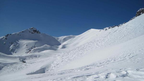 viele Spontanschneebretter kleinerer und mittlerer Grösse und sogar eine kleine Fernauslösung; durch den vielen Triebschnee sehr heikle Verhältnisse. Gipfelaufstieg nur dank der abgeblasenen Rippe, die erst im letzten Moment zum Vorschein kommt, möglich.