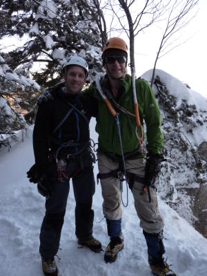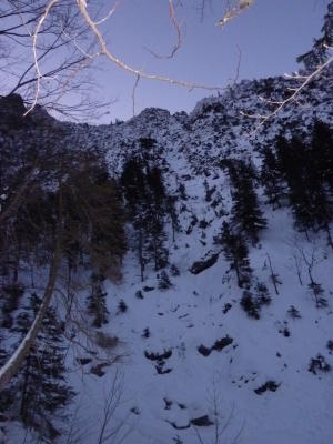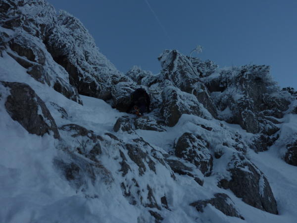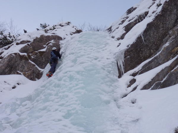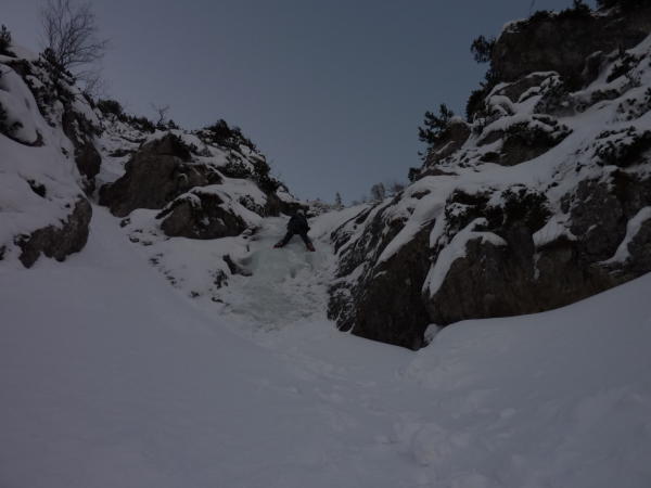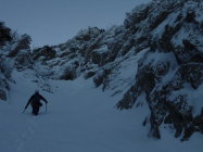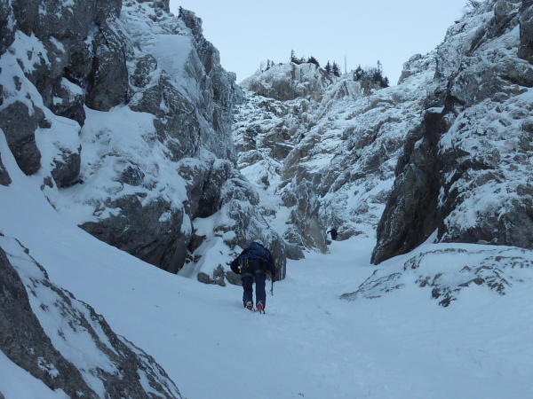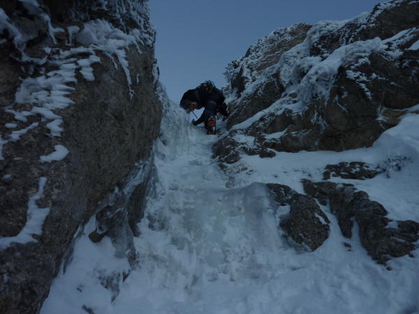 Jochberg rechte Rampe Die rechte Rampe zieht sich rechts vom rechten Gully hoch und überwindet auf ca 600 Hm einige Steilstufen. Dazwischen immer wieder kurze Abschnitte in Gehgelände. Nach ca. 400Hm heißt es dann Schneestapfen. Auf den letzten Hm geht es dann über kurze Kletterei zum Normalweg rauf (siehe auch Eiskletterführer).