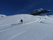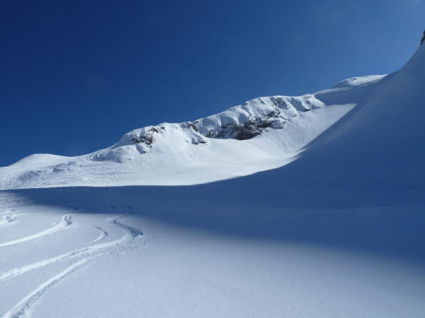 Perfekte Pulverschneeabfahrt vom Gipfel bis kurz oberhalb Weglosen, wo man auf die Spuren der Normalroute stösst.
