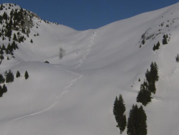 Da erst am Mittag gestarted ziemlich warm bis Oberbärgli. Schnee Exp. West Nordwest teils Pulvrig manchmal Winddeckel mit cirka 20-30cm Gries darunter zum spuren mit Schneeschuhen ziemlich anstrengend darum ab Oberbärgli in die Südhänge unter dem Solhore ausgewichen dort oben angefeuchtet darunter tragfähig.