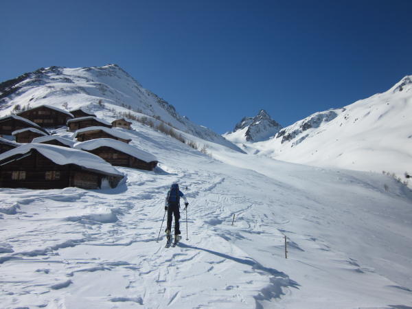 Schneemässig hatten wir heute alles erlebt: von feinstem Pulverschnee beim Aufstieg durch den Graben des Faldumbaches hoch zum Nordhang des Niwen (wir haben es bereut, nicht wieder auf diese Seite hin abgefahren zu sein!), aber teilweise auch mühsamer Winddeckel-Schnee bei der Abfahrt auf dem Südhang vom Niwen hinunter nach Jeizinen, sogar Firn/ Sulz war mit dabei.