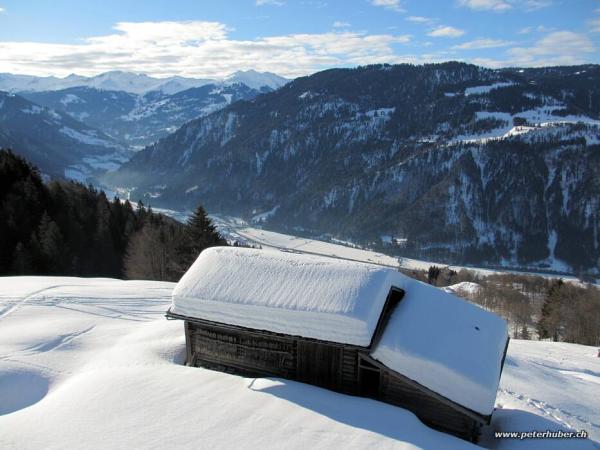 Viel zu warm! Super schönes Wetter, ein Genuss. Es hat genug Schnee für die Abfahrt bis nach Fanas.