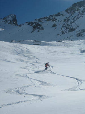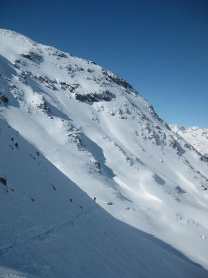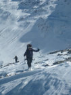 Gute Verhältnisse; die letzten steinigen 100 Höhenmeter zum Gipfel müssen allerdings zu Fuss gemacht werden - auch hier hat der Sturm gewütet!