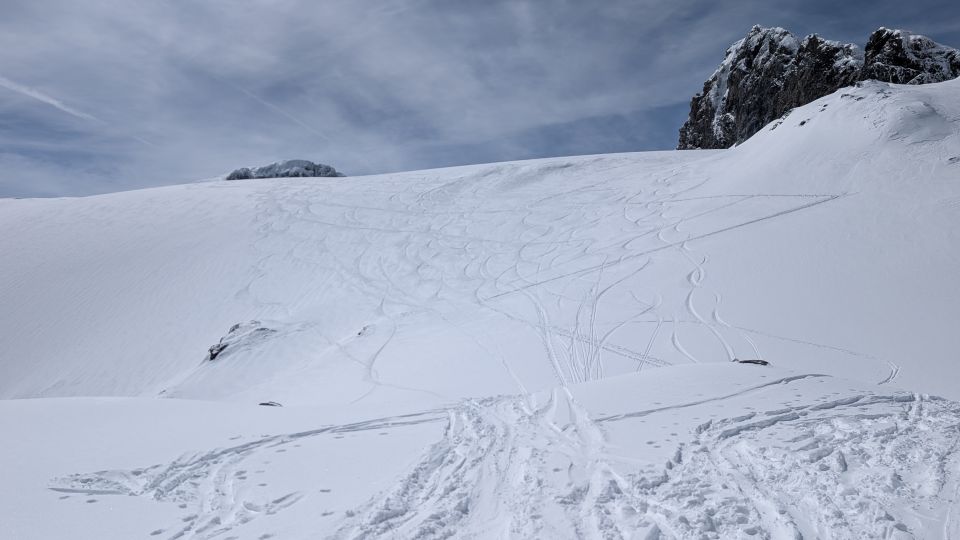 Abfahrt: Heute Pulver bis etwa 2.300m hinab, darunter sowie an sonnenexponierten Stellen unter dem Iswändli allerdings heute angefeuchtet. Mit vorsichtiger Spurwahl geht es ohne Steinkontakt oder abschnallen.