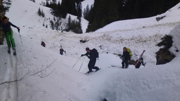 Im Couloir Nördlich von Bärefeld (wo auch der Alpweg durch führt) waren durch Selbstauslösung Nassschnee Lawinen runter gekommen. Diese haben die Aufstiegsspur verschüttet. An steilen Hängen haben sich leicht Schneeknollen gebildet welche den Hang runter rollten. In der Nordwand vom Zahm Andrist war es am Nachmnittag auch kaum ruhig, es kam immer wider was runter.